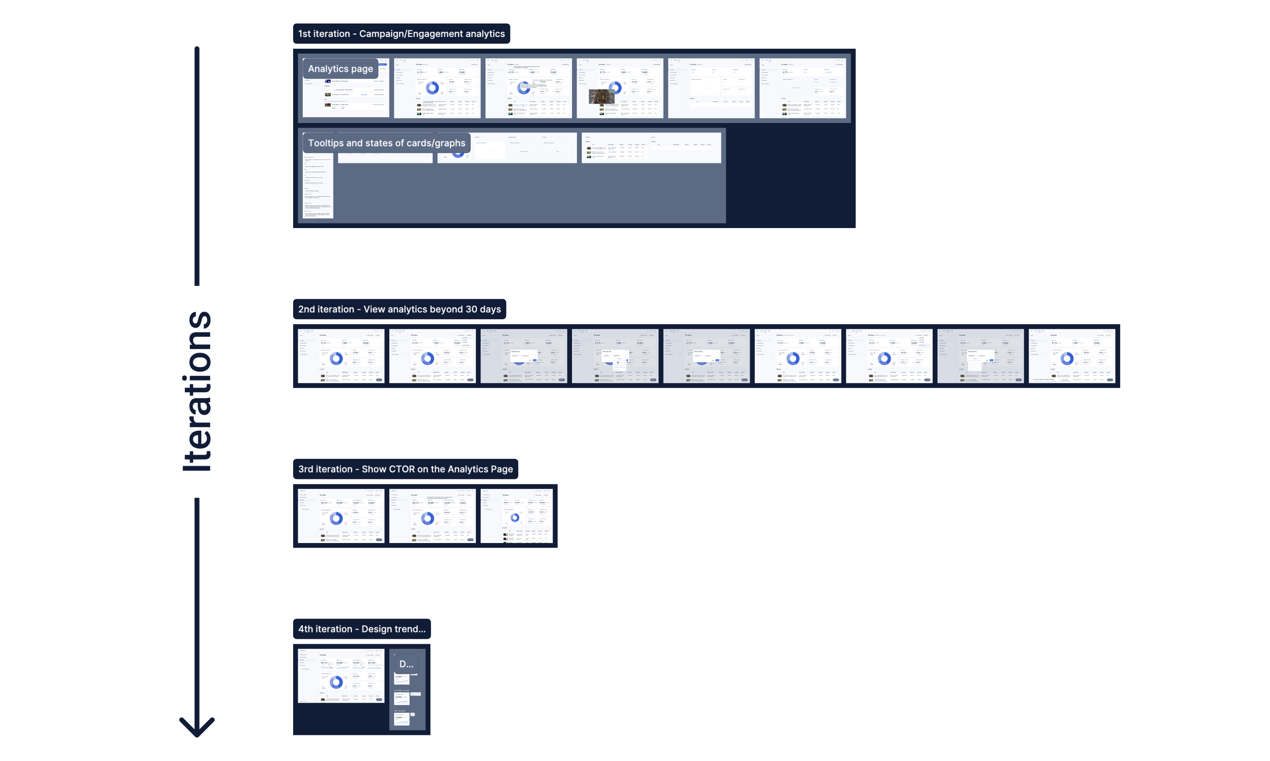 It was then clear what we needed to do; we needed to show analytics at multiple levels but didn’t know how to. So, I looked into similar platforms (e.g. Mailchimp, Sailthru, Active Campaign, etc.) to see what this feature could look like, and I saw a trend of dashboards, graphs, and tables all displaying metrics and other values.